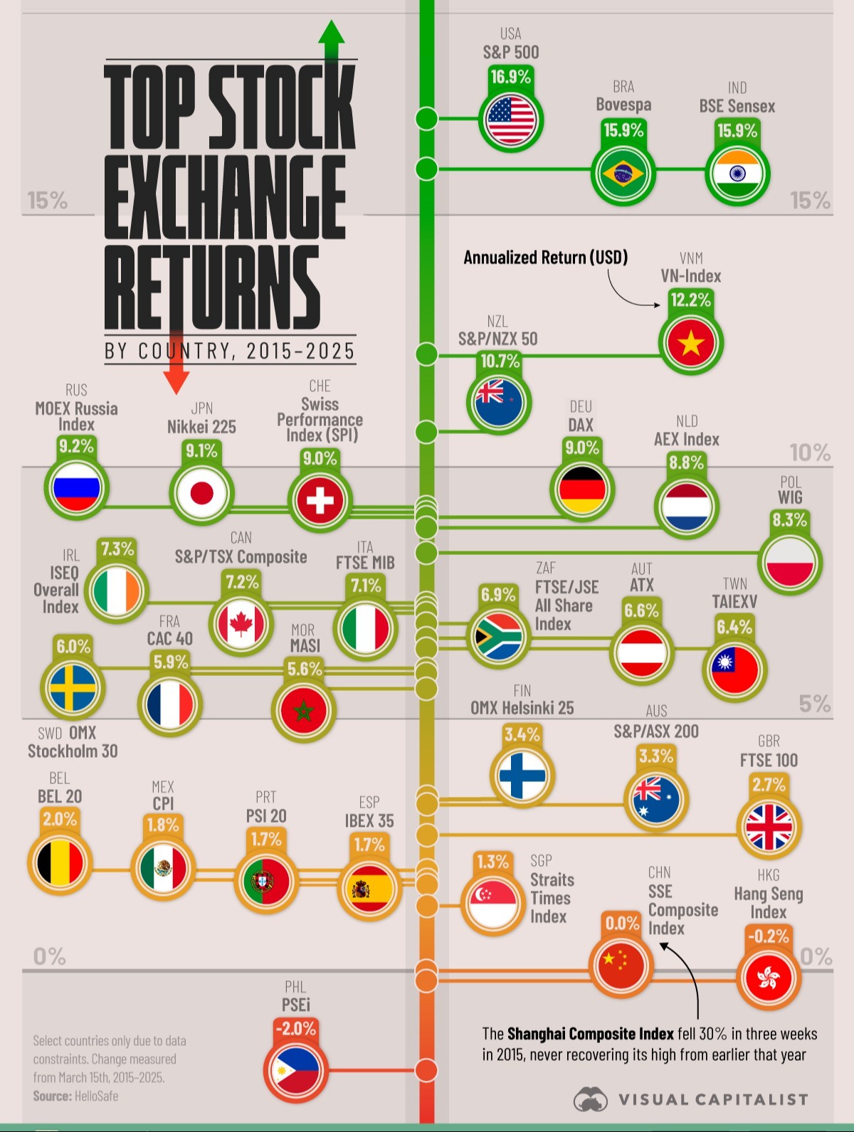 Over the past 10 years, the S&P 500 has been the standout performer among major global indexes, delivering a staggering 17% annualized return. That means a $10,000 investment would have nearly quintupled to $50,000 in the S&P 500. That wasn’t the only market posting impressive gains, however. Indexes from Brazil, India, and Vietnam also turned in strong double-digit returns, outpacing their counterparts in Europe and much of Asia.